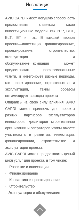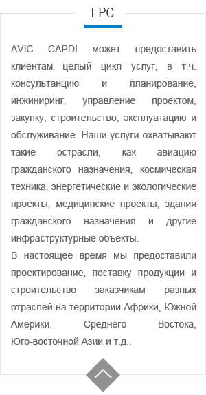 AVIC CAPDIможет предоставлять клиентам разных отраслей такие услуги, как инжиниринг, архитектурное проектирование, строительство, охрана окружающей среды и консалтинг. Мы всегда предлагаем клиентам оригинальные и инновационные решения с низкой себестоимостью и высокойэффективностью. Отгражданской авиации и авиации общего назначения, оборонной и военной баз, энергетического и экологического сооружений, строений гражданского назначения, промышленных сооружений до медицинских строений, AVIC CAPDI в силах предоставить специальное планирование, проектирование и строительство с тем, чтобы постоянно удовлетворять ожидания клиентов..